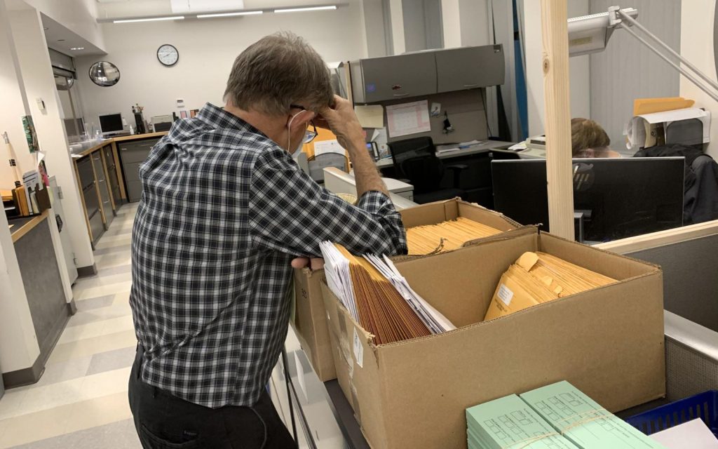 He paces around the quiet office searching for the lost ballot. His first instinct is to check the two boxes filled with spoiled ballots. Nutting carefully flips through about 200 discarded ballots in search of Brian Trelstad. No luck.
