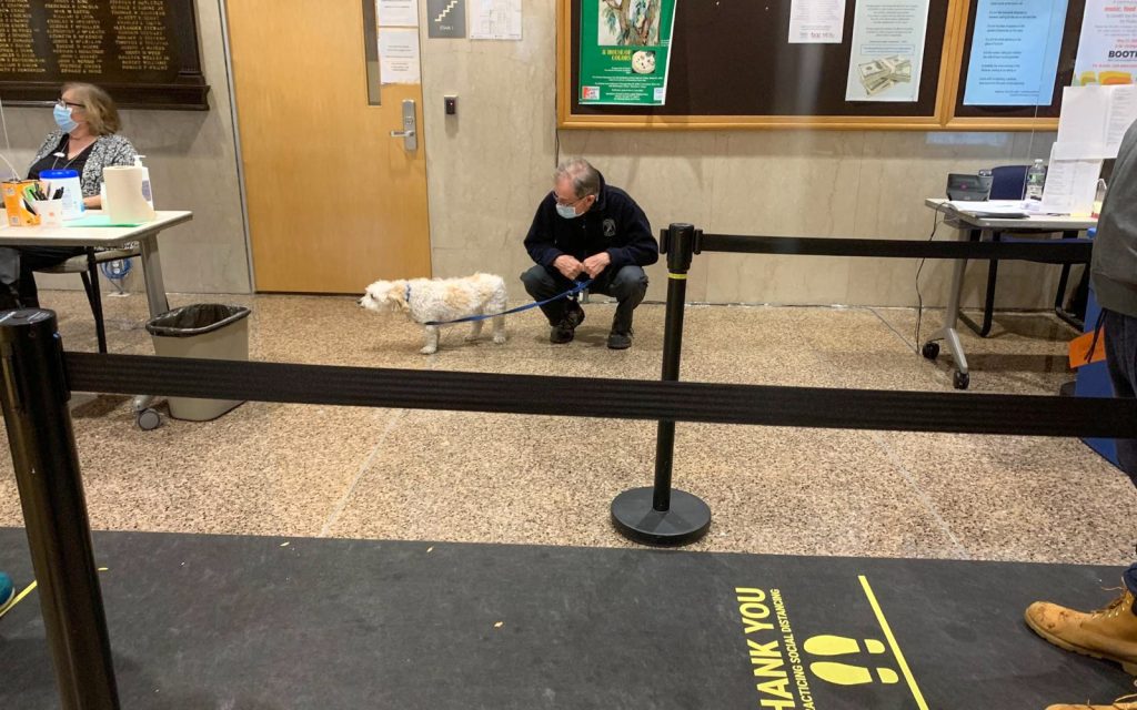 At about 11:50 a.m. a young woman in a beanie, holding a small dog on a leash, reaches the front of the line. She isn’t the first person to bring their dog in to vote today.