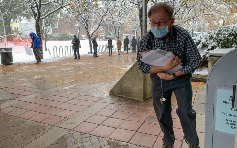During the extensive search for the lost ballot, snow had descended over Town Hall. The trees surrounding the building, with their orange and red hues, were suddenly accented with shades of white.