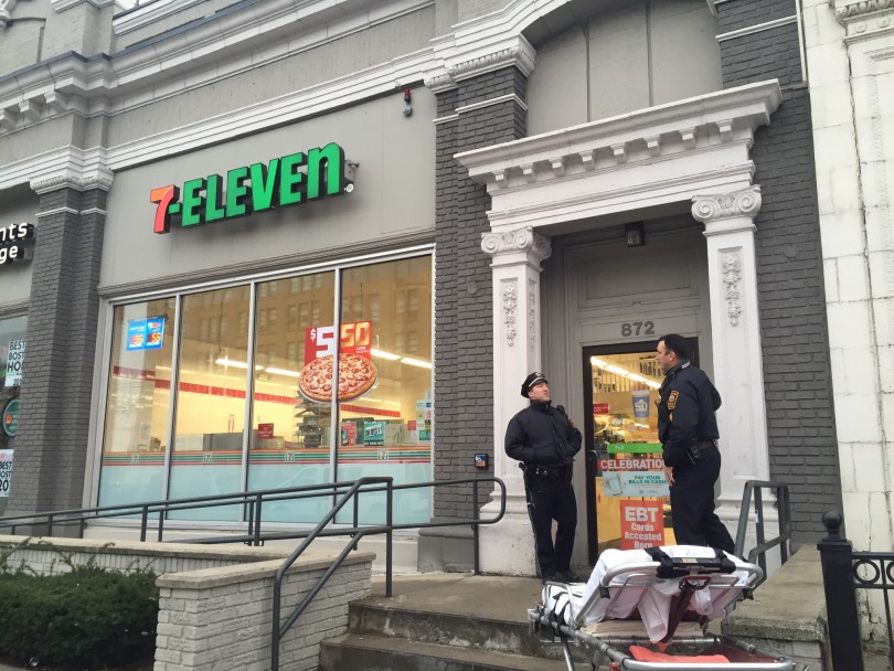 Officers seal off the crime scene at a 7-Eleven on Commonwealth Avenue near St. Paul Street on Boston University's campus Friday morning. (Photo: Andrea Asuaje/BU News Service)