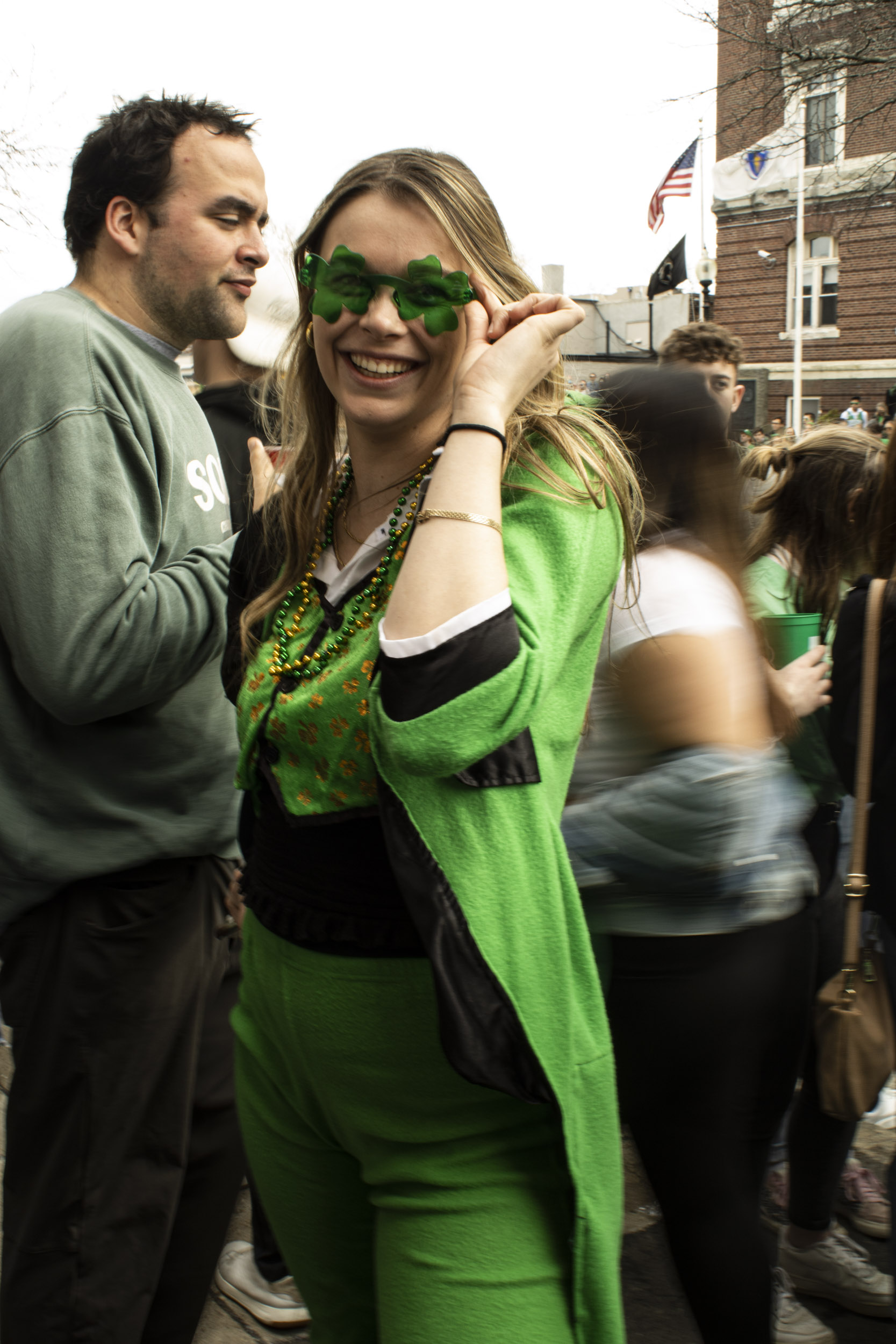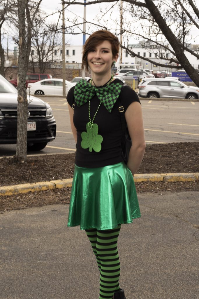 Sarah Sullivan sports a festive leprechaun-inspired outfit, speckled with gold accents. (Photo by Zeinab Diouf/BU News Service)