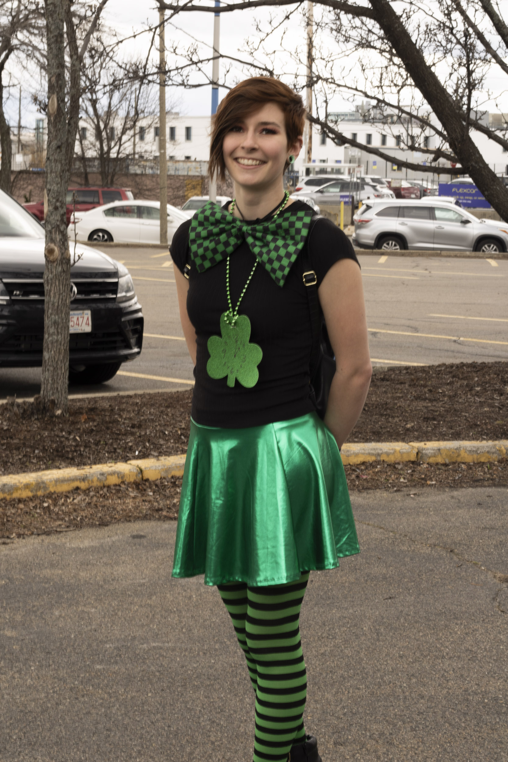 Olivia Lessard shows off an impressively large bowtie and shamrock chain. (Photo by Zeinab Diouf/BU News Service)