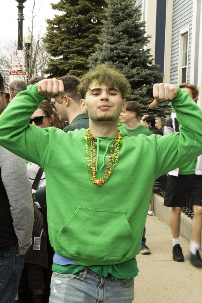 Bobby Manning, dusted with green dye, strikes a pose. (Photo by Zeinab Diouf/BU News Service)