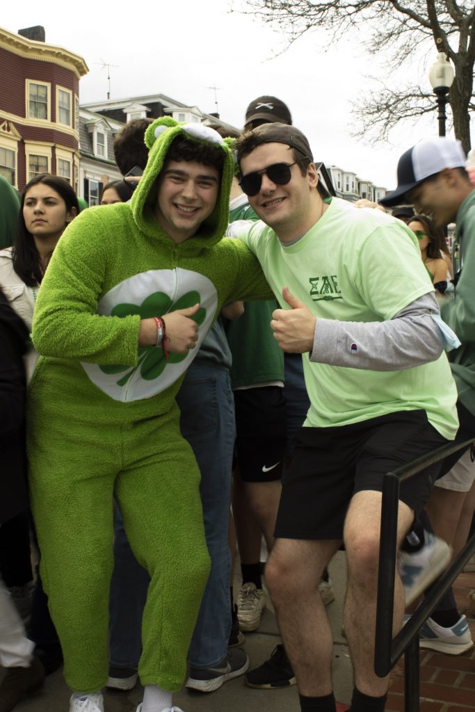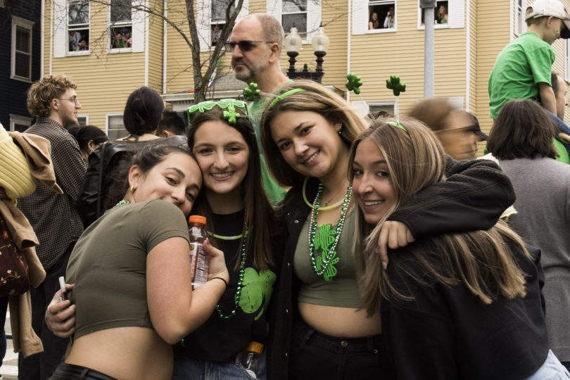 A friend group makes their way to the parade, wearing minimalist green accents. (Photo by Zeinab Diouf/BU News Service)