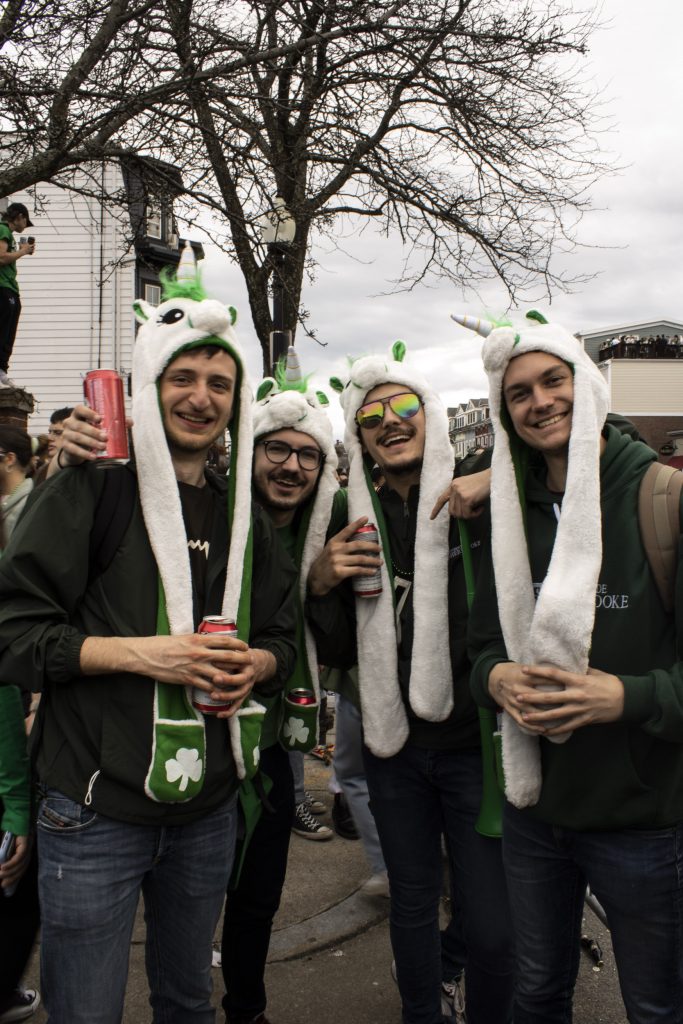 Quentin Richard (left), Victor Dupont (middle), and Teo Orovault (right) don some matching green unicorn hats with shamrock accented pockets. (Photo by Zeinab Diouf/BU News Service)