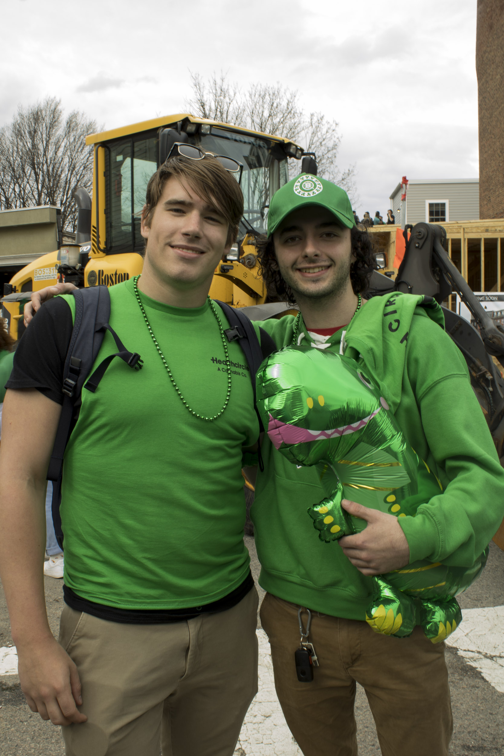 Sean Ravel (left) and Henry Buda (right) bring along a helium, emerald green dinosaur to the parade. (Photo by Zeinab Diouf/BU News Service)