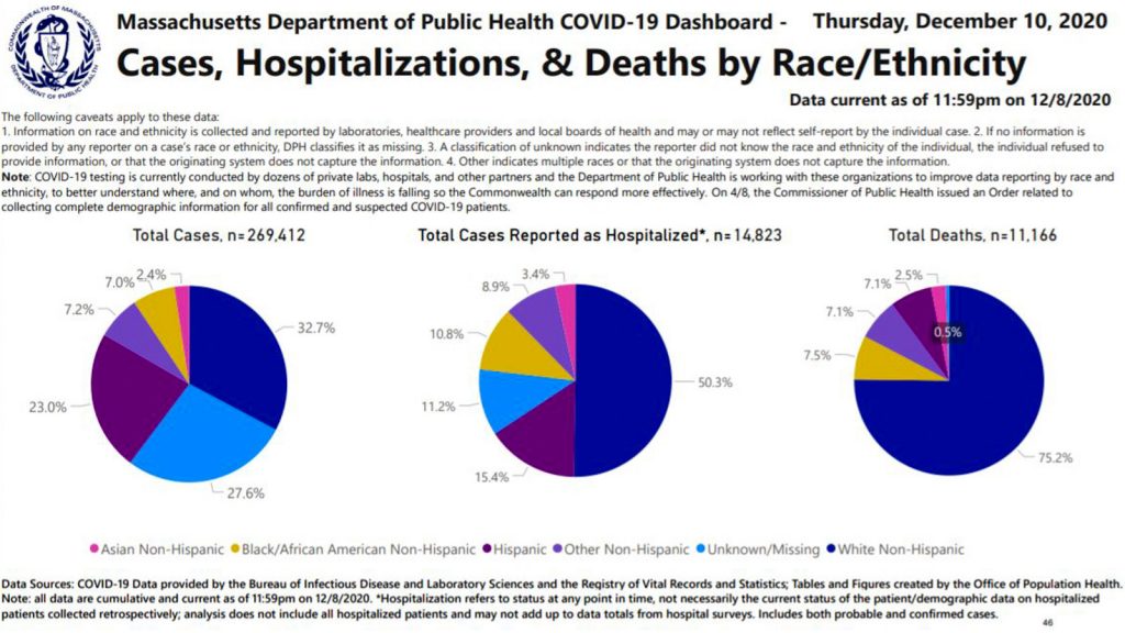 Around 37,000 Native Americans and Alaskan Natives live in Massachusetts – comprising around 1% of the state’s population – according to the 2010 Federal census. Other demographics, such as Native Hawaiian or Pacific Islander, are absent from the weekly demographic breakdown by the Massachusetts Department of Public Health.