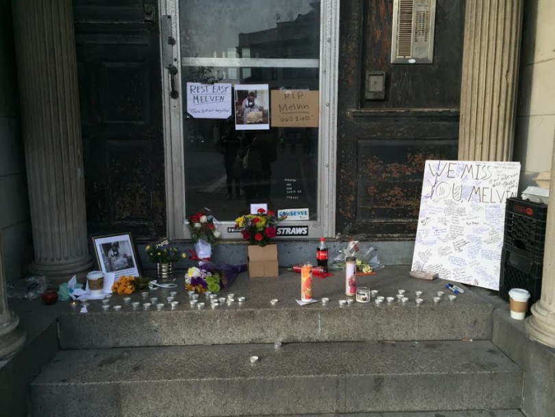 A tribute to Melvin Ramos, a homeless man who recently died, slept on this stoop in Kenmore Square