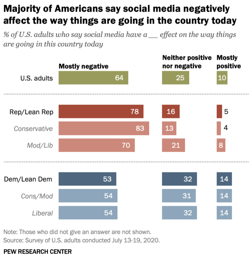 However, the Pew Research Center found that 64% of Americans “say social media have a mostly negative effect on the way things are going in the U.S. today,” in 2020.